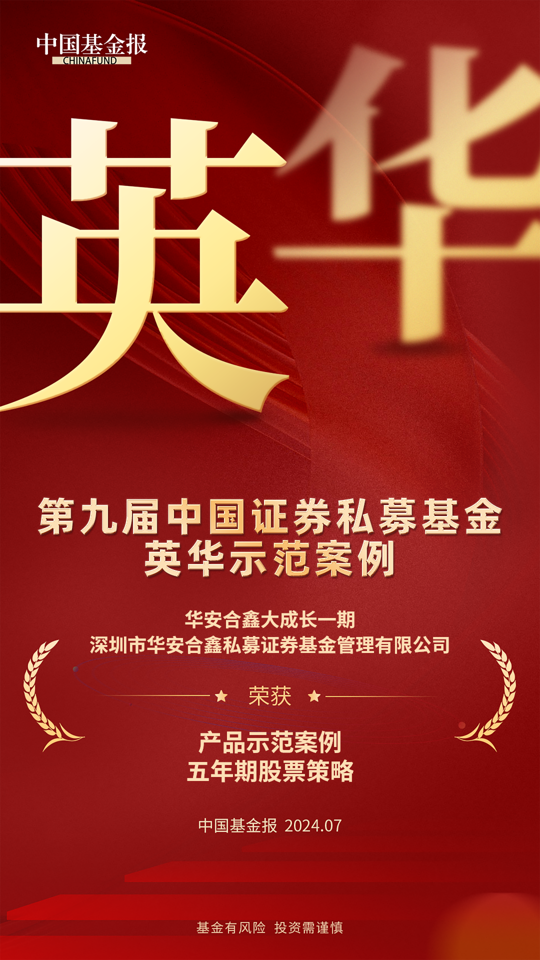 2024年7月10日,由《中国基金报》主办的“2024中国资本市场发展论坛暨上市公司论坛、私募基金论坛”在上海举行,期间隆重揭晓了“2024年中国证券私募基金英华奖”评选榜单。凭借长期良好的投资业绩、深厚的研究功底以及合规、专业的公司管理作风,华安合鑫一举斩获两项英华奖殊荣。其中华安合鑫荣获“综合实力50强示范机构(股票策略)”,公司产品华安合鑫大成长一期荣获“五年期股票策略产品奖”。