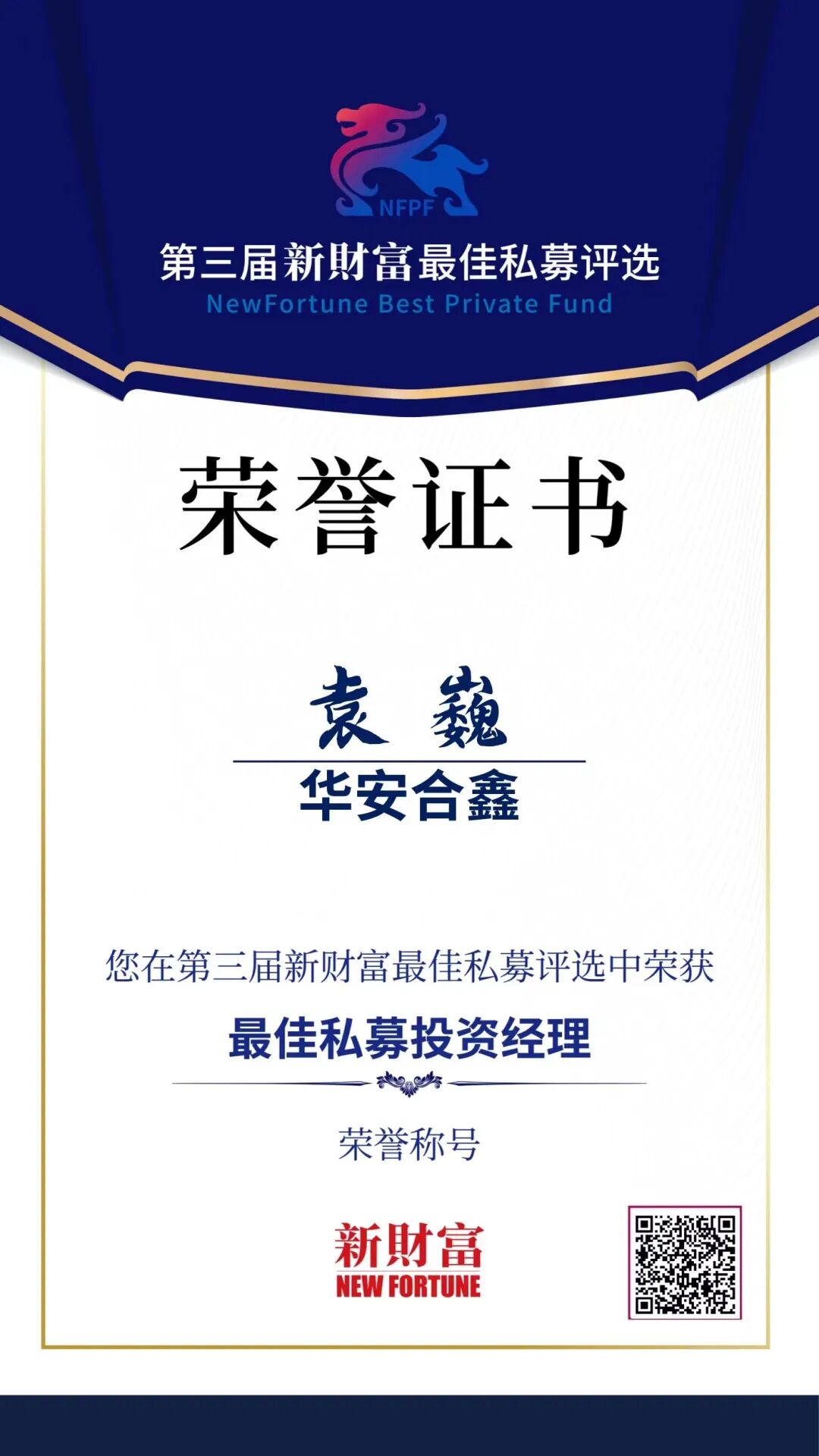 2022年8月2日,第三届新财富最佳私募评选结果重磅揭晓,深圳市华安合鑫资产管理有限公司创始人兼投资总监——袁巍,荣获“最佳私募投资经理”的称号。